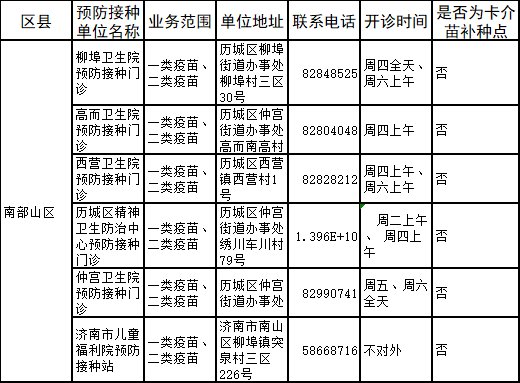 | 南部山区 | 柳埠卫生院预防接种门诊 | 一类疫苗、二类疫苗 | 历城区柳埠街道办事处柳埠村三区30号 | 82848525 | 周四全天、周六上午 | 否 |
