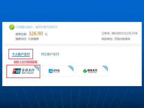 跳转到统一结算平台后,选择个人或对公账户支付,支持银联在线、微信、支付宝支付。