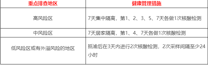 2.根据各地疫情形势,重庆制定了重点地区来渝返渝人员健康管理措施,重点地区范围详情可以【】。除内蒙古、广东、四川、贵州、云南、宁夏、西藏以及新疆等重点地区有相应的来渝返渝人员健康管理措施之外,其他重点地区来渝返渝人员的健康管理措施,大致可以分为三类: