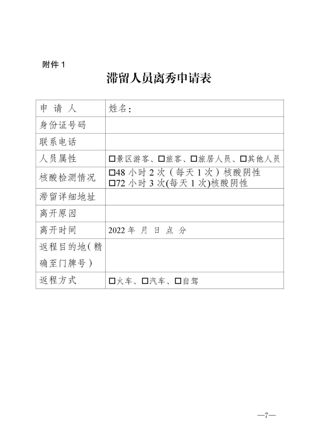 (1)2022年10月7日起,滞留人员可申请离秀。如实填报《滞留人员离秀申请表》(附件1)。由景区、酒店、社区(村居)安排专人统一报主管部门和乡镇(街道)审核;