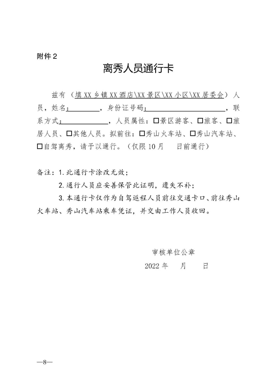 9.各属地乡镇(街道)政府。负责属地内相关返程工作的沟通联络,本乡镇(街道)非小区的离秀人员身份认定,发放认定人员《离秀人员通行卡》,收集旅居离秀人员行程信息报县交通局,处理本乡镇(街道)滞留人员转移,为返程人员转送工作提供便利条件等工作,负责国省县乡道自驾离秀人员信息核验。