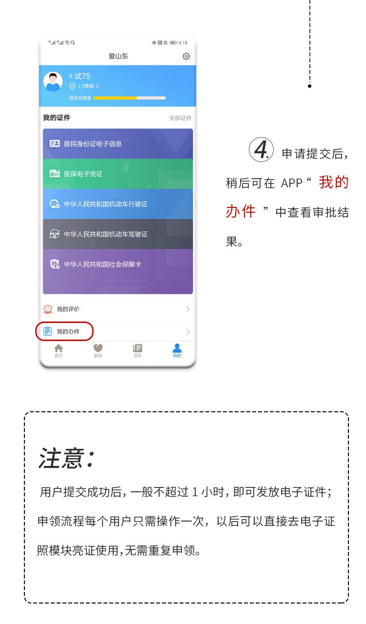 用户提交成功后,需后台数据核验和信息同步,一般不超过1小时,即可发放电子证件;申领流程每个用户只需操作一次,以后可以直接去电子证照模块亮证使用,无需重复申领。