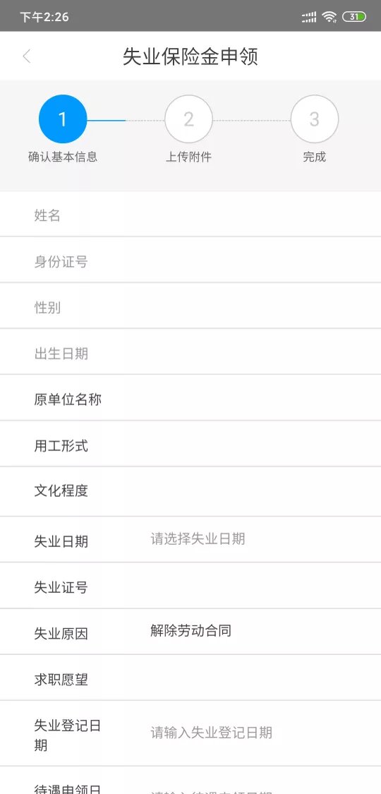 7、点击“失业金申领”后进入如下界面,如实填写信息,红色字为“必填”项。