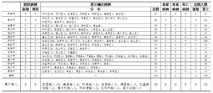 山东无本地住院疑似病例、确诊病例。累计报告确诊病例763例,死亡7例,治愈出院756例。
