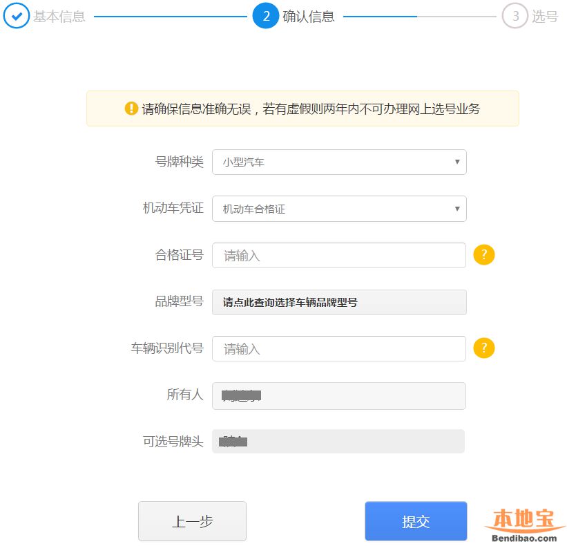 在该步骤,用户需要录入本人本单位的新购小型汽车的车辆识别代号、选号凭证,如下图所示:
