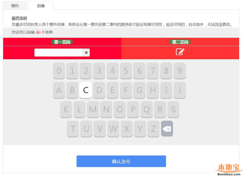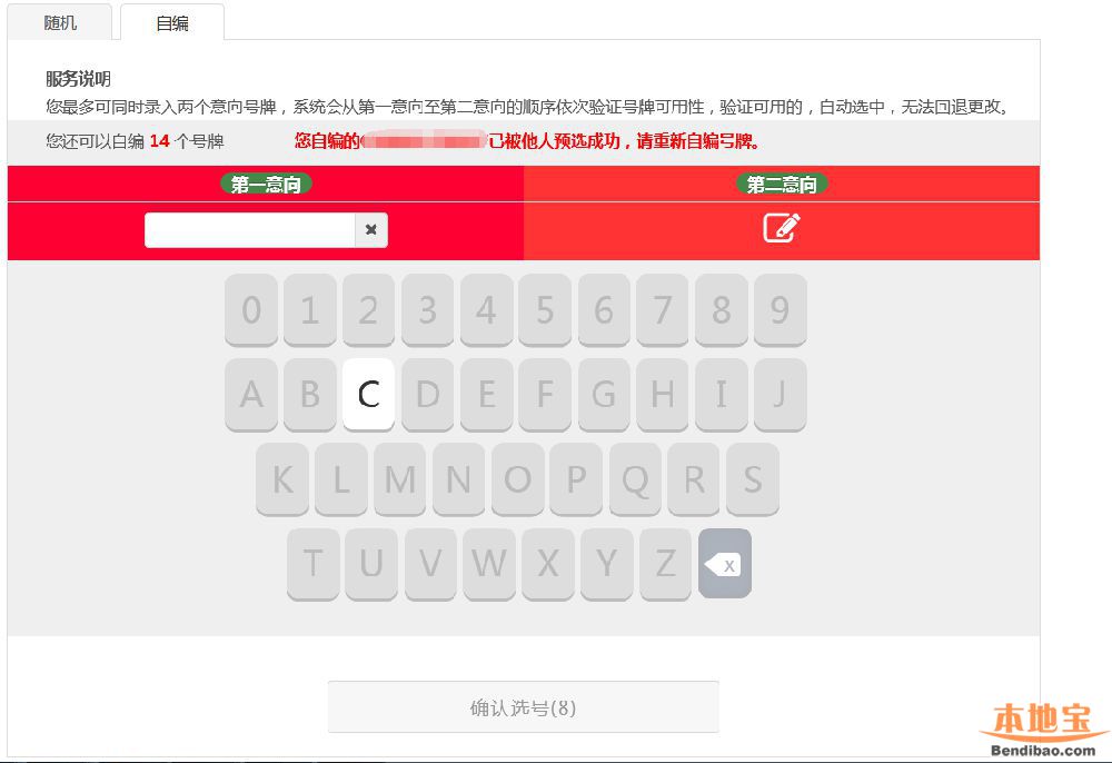 用户对多次随机的号牌号码不满意,并且还拥有自编选号机会,可点击“自编”Tab页跳转到自编选号操作页面。