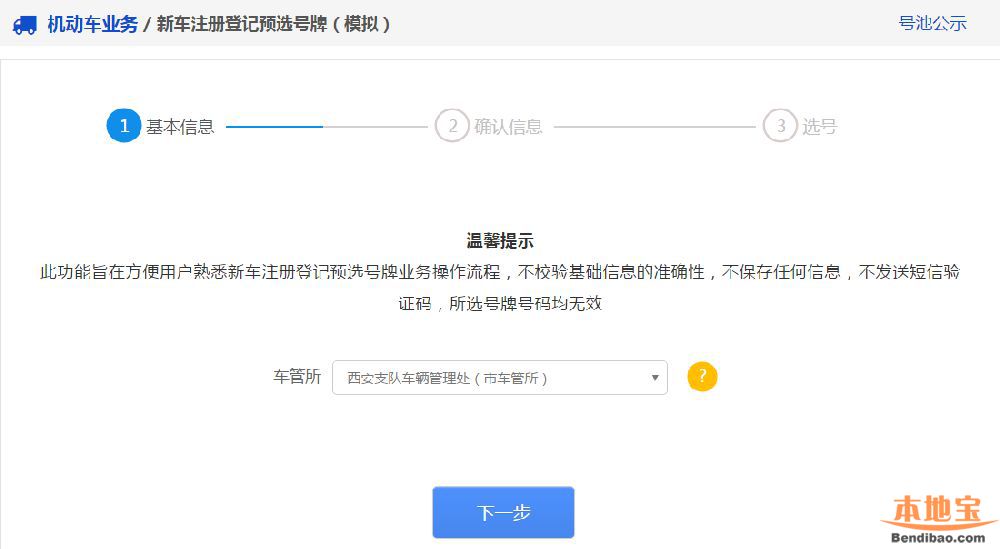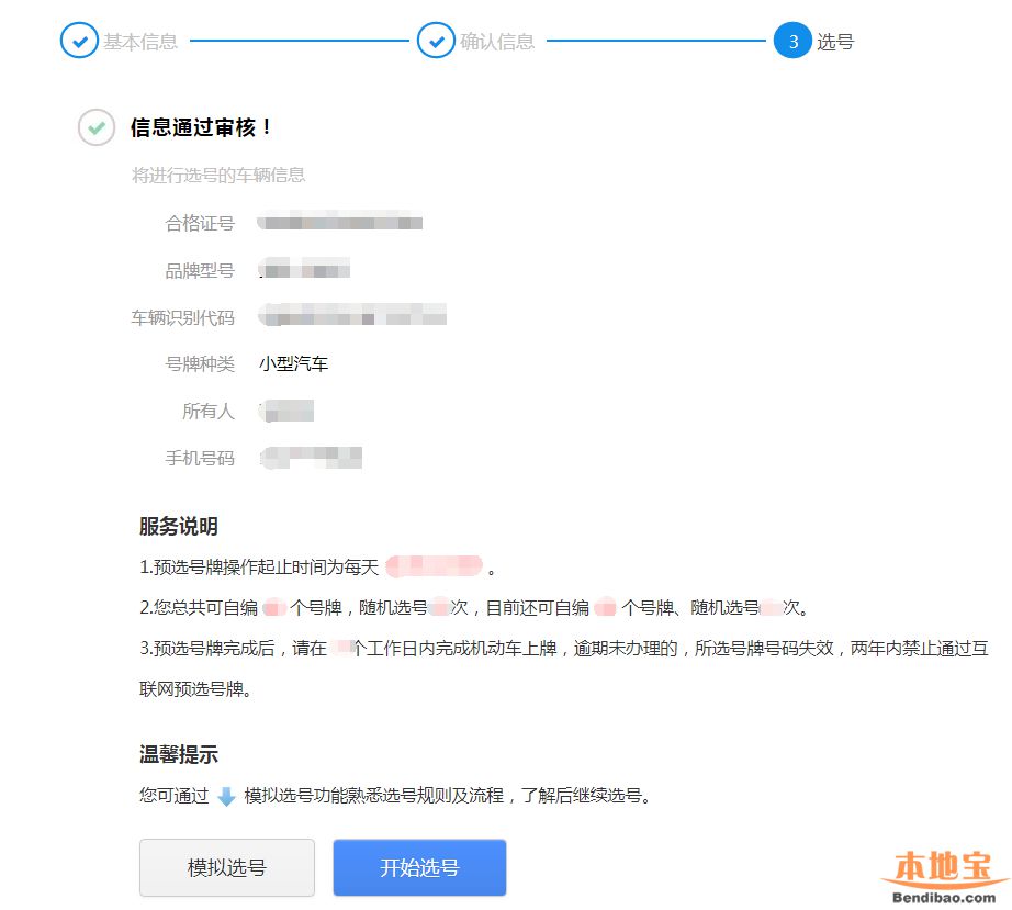 第一阶段(【步骤1:基本信息】→ 【步骤2:确认信息】→ 【步骤3:选号服务说明】)→ 第二阶段( 【步骤1:本人选号手机验证】→ 【步骤2:预选号牌】→ 【步骤3:完成号牌预选】)
