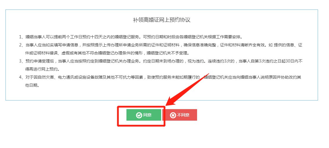 第八步:阅读“补领离婚证网上预约协议”,点击“同意”