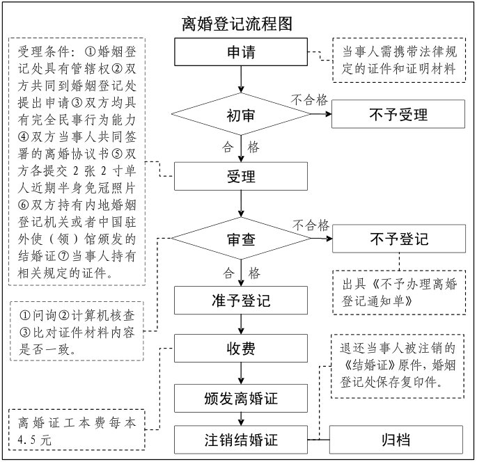 ①初审:审查当事人是否符合申请离婚登记的条件。