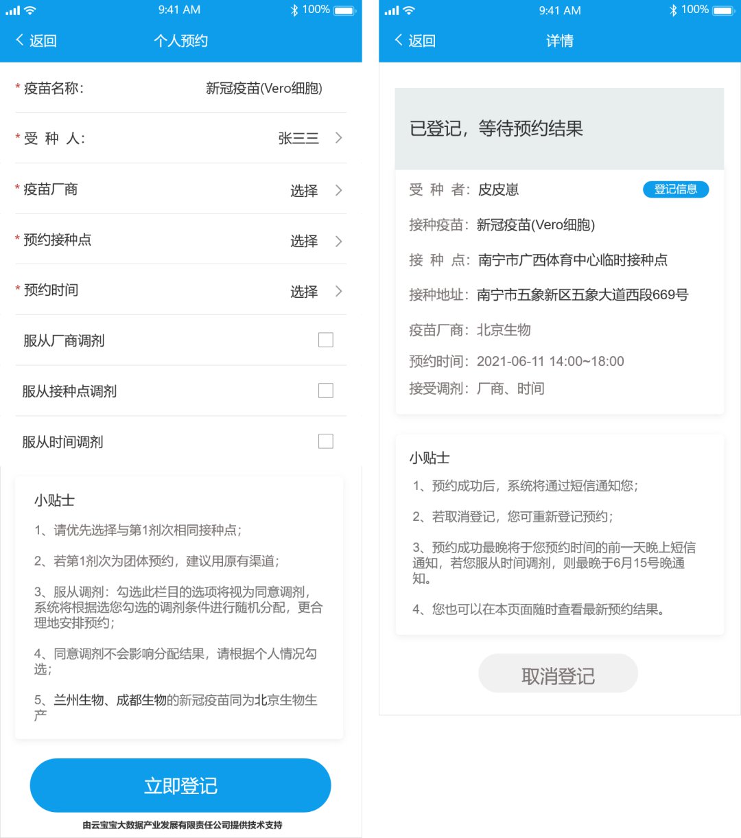 完成个人信息登记,并满足第二剂次疫苗预约条件的群众,可在“个人预约”页面,登记意向接种的接种点、接种时间及疫苗厂商,并可选择是否服从调剂,完成预约接种登记后,等待系统的随机分配结果。