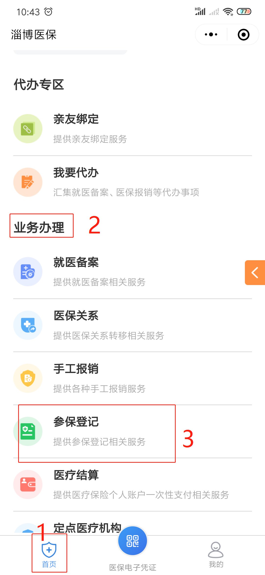 第三步:在淄博医保首页下拉,看到【业务办理】中的【参保登记】并点击选择。