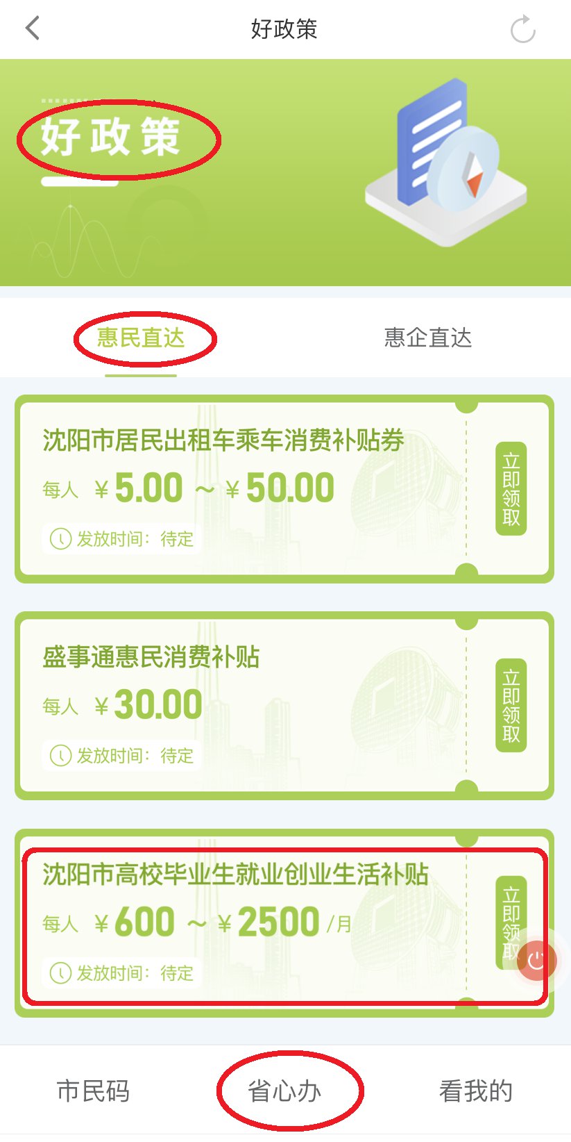 盛世通首页下方“省心办”→“好政策”→“惠民直达”→“沈阳市高校毕业生就业创业生活补贴”点击“立即领取”,按提示步骤进行申请。