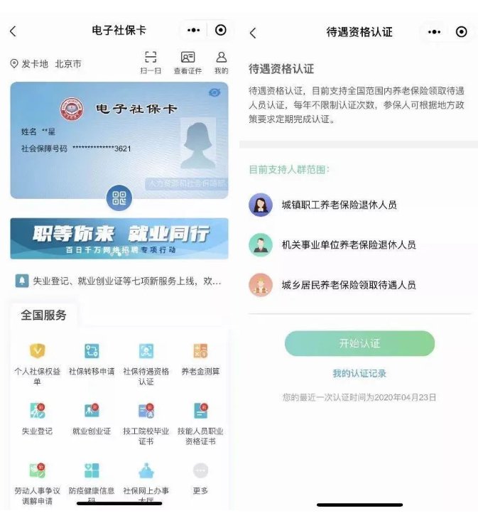 一、已经申领了电子社保卡的您,可在电子社保卡首页点击“全国服务”—“社保待遇资格认证”,再点击“开始认证”,按操作提示进行即可。