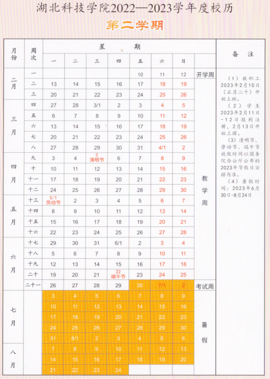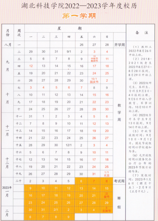 湖北科技学院校历2022-2023(源自官网,如有变动以学校实际情况为准)