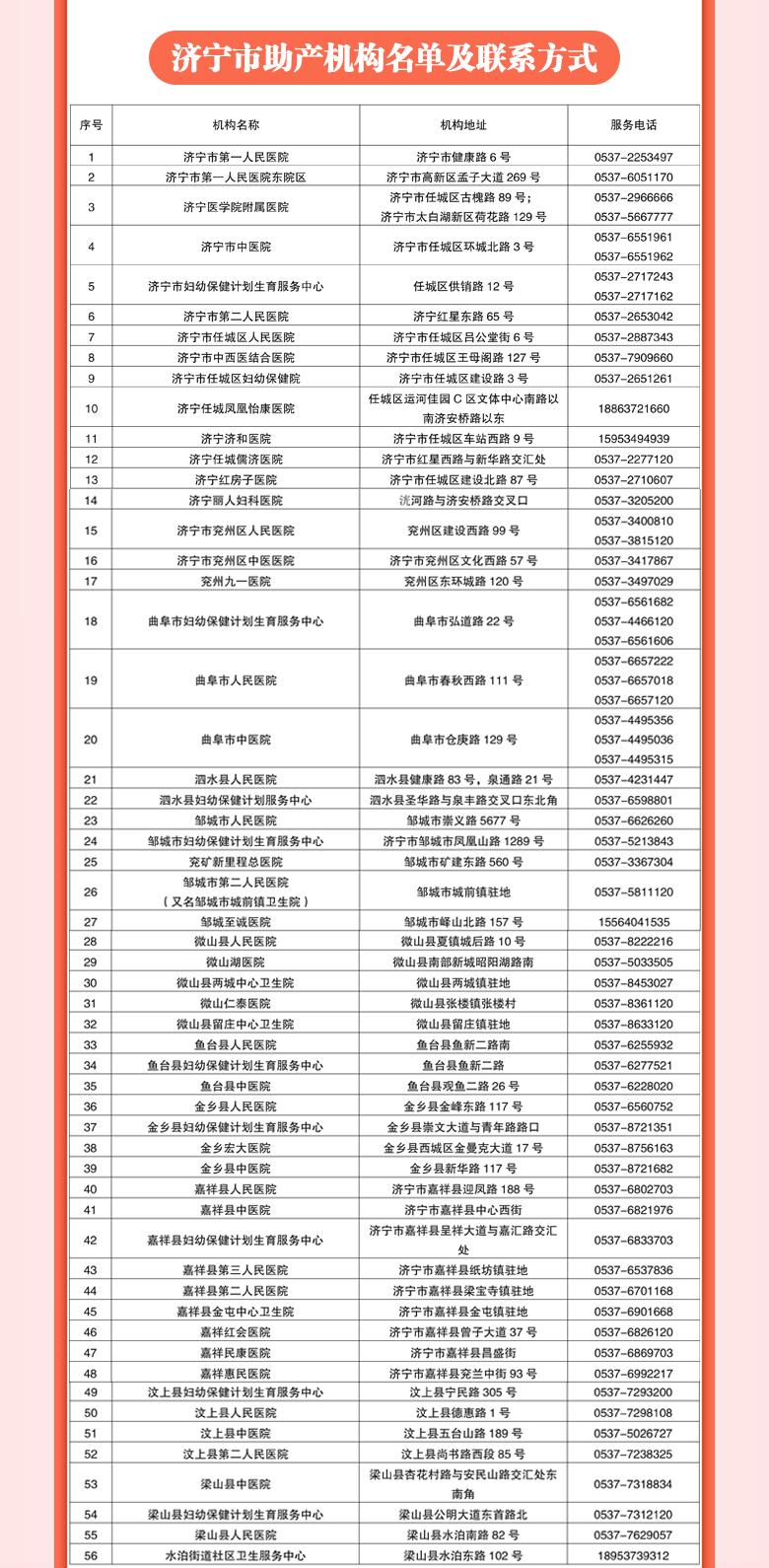 济宁确定以下医疗机构作为“应急助产机构”,用于应急承接普通孕产妇产检和住院分娩工作。保障妇女儿童生命安全与身健康: