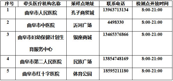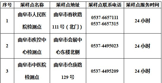 为进一步做好全市新冠肺炎疫情常态化防控工作,更好地方便群众及时就近开展核酸采样,确保重点人员“应检尽检”、有需求人群“愿检尽检”,曲阜市自3月16日起新增5个免费新冠病毒核酸检测采样点,现将新增名单公布如下: