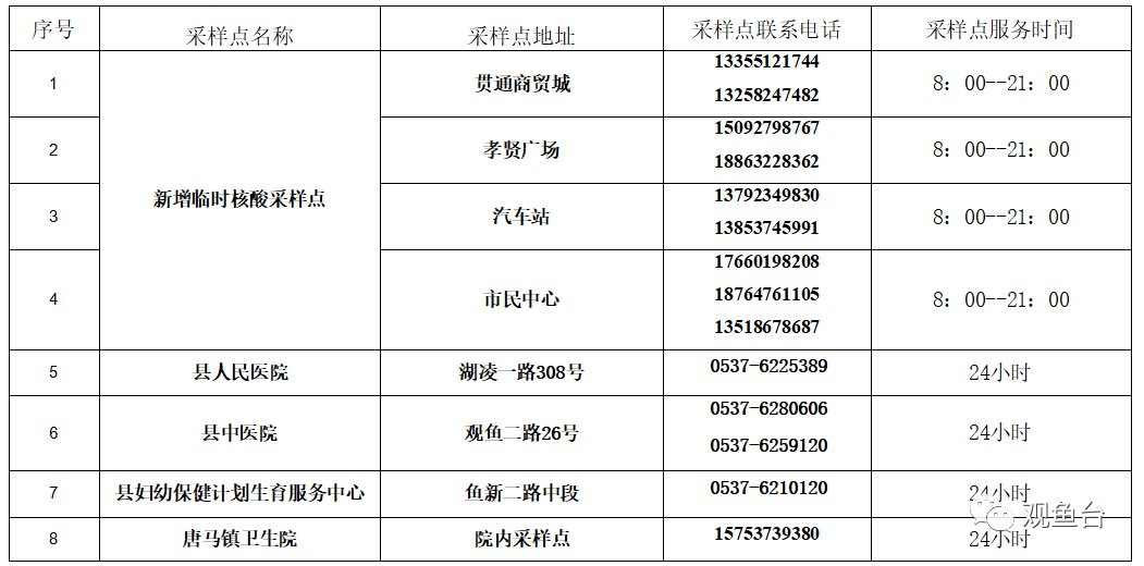 为进一步做好,全县新冠肺炎疫情常态化防控工作,更好地方便群众及时就近开展核酸采样,确保重点人员“应检尽检”,有需求人群“愿检尽检”,鱼台县近日新增4个免费新冠病毒核酸检测采样点,截至目前,鱼台免费新冠病毒核酸检测采样点达18个,现将免费采样点名单公布如下。前往采样时,请保持一米线距离,防止发生交叉感染。听从现场工作人员指引,主动配合,有序排队,采样完成后,请有序离开,不在采样点逗留。接种新冠病毒疫苗人员,在接种超过48小时后方可进行核酸检测。