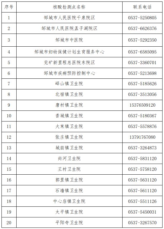 自8月2日起,邹城市自外地返回人员主动申请核酸检测一律免费,现将全市各核酸检测点通告如下,请返回人员及时携带本人身份证,做好个人防护,到就近检测点进行检测。