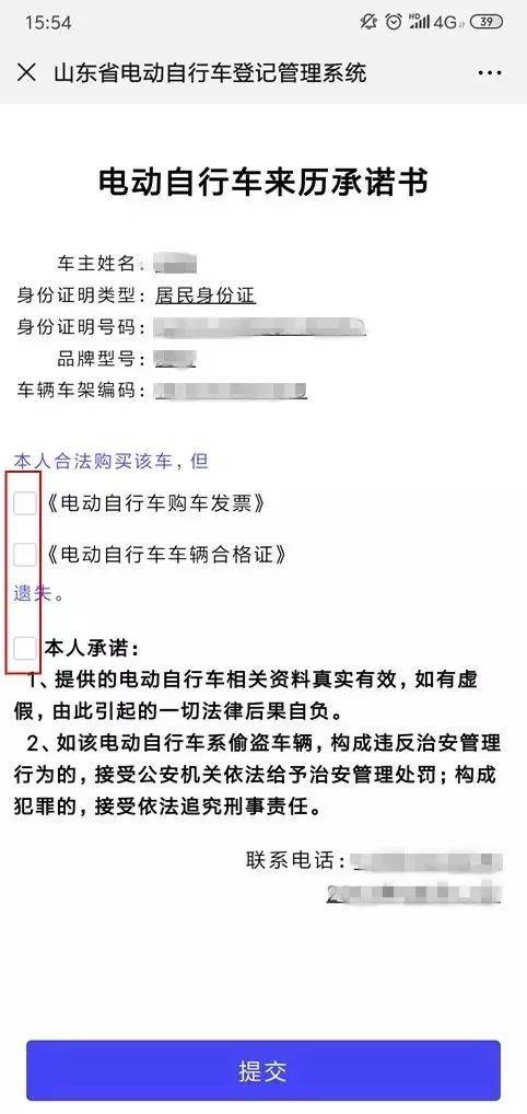 4.若车辆发票、合格证丢失,系统里有电子版的《电动自行车来历承诺书》, ✔勾选下方三个位置就可以哦。