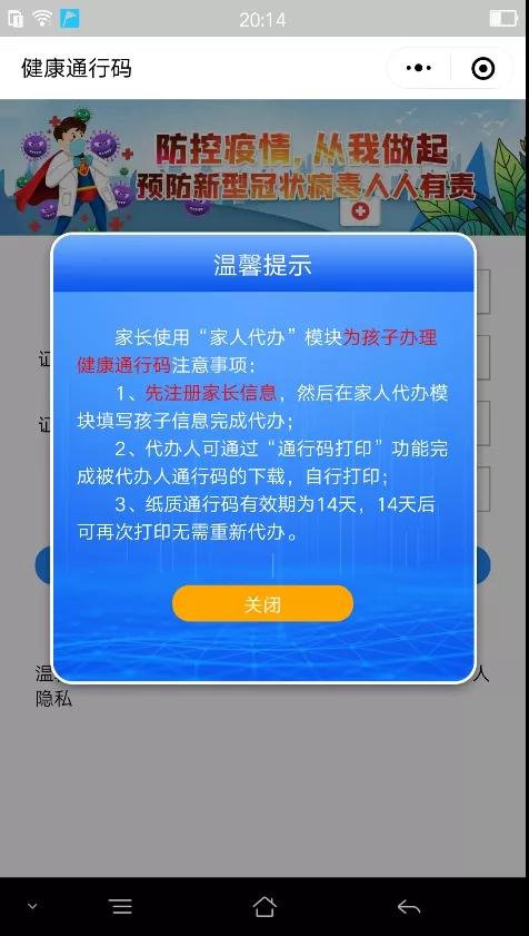第六步:再使用“为家人代办”模块为孩子办理健康通行码此时填写学生信息