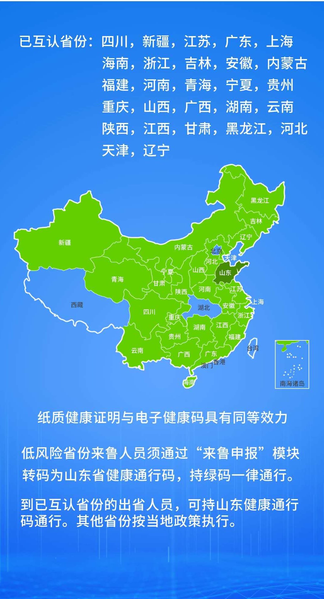 外省来鲁(返鲁)未满14天人员,可通过“已互认省份”查看我省与其他省份健康码互认情况,“绿色省份”表示我省已实现与其他省份健康码互认共享。从已互认省份来鲁的人员,到达我省后凭省外绿码一律放行,不需隔离,外省纸质健康证明与电子健康码具有同等效力。