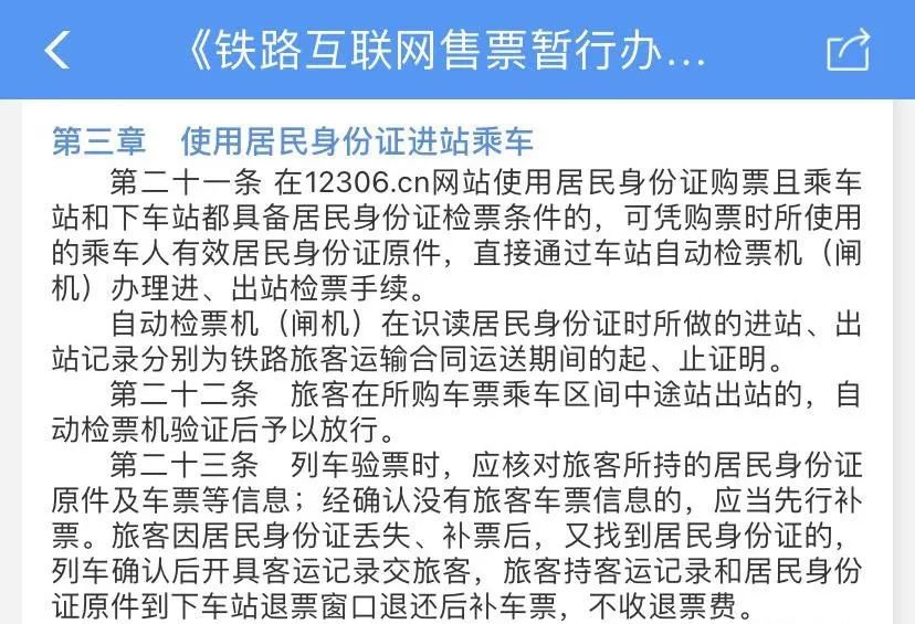 《铁路互联网售票暂行办法》第二十一条:使用居民身份证购票且乘车站和下车站都具备居民身份证检票条件的,可凭购票时所使用的乘车人有效居民身份证原件,直接通过车站自动检票机(闸机)办理进、出站检票手续。