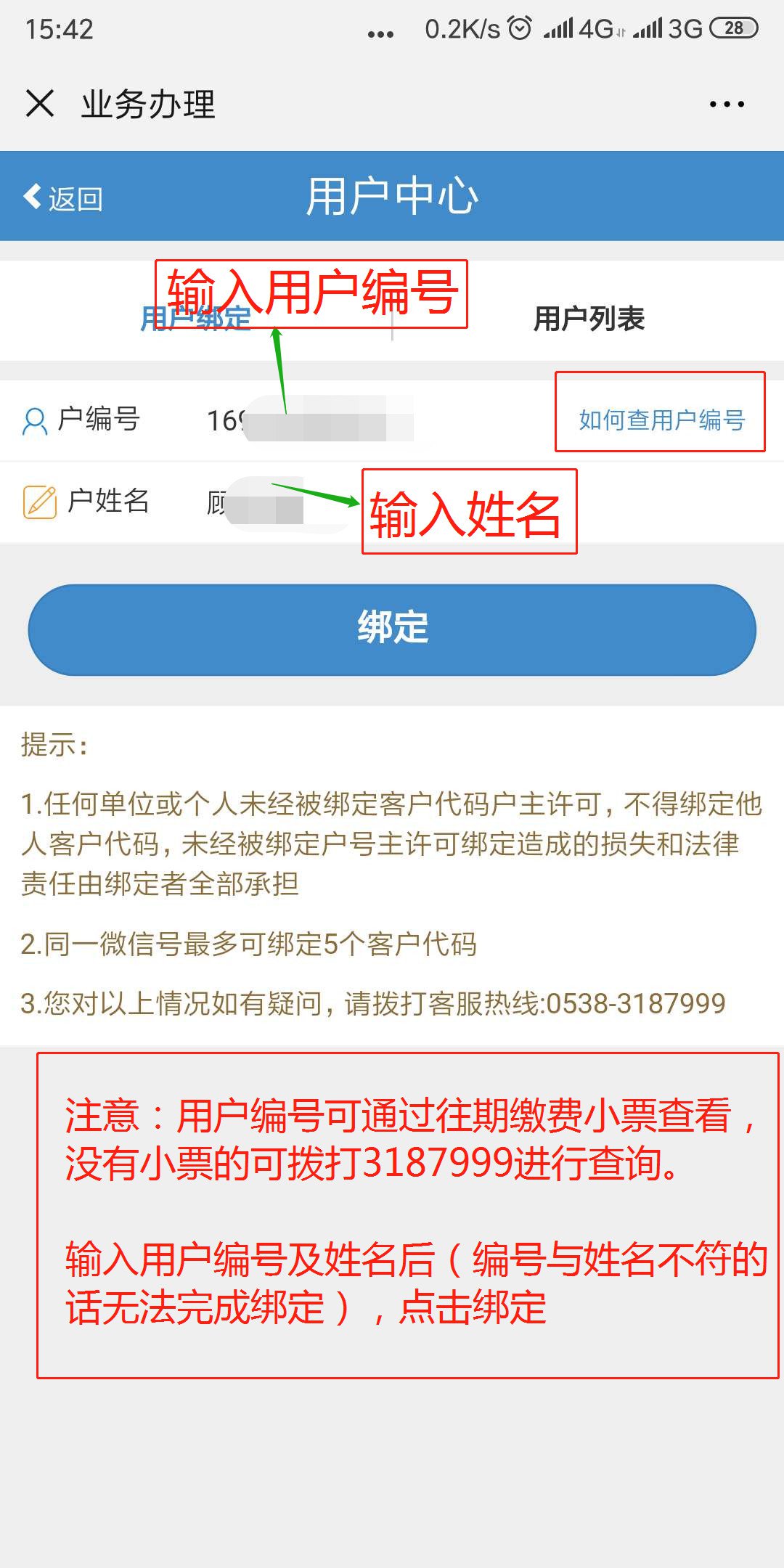 2)用户编号及姓名一定要相对应,如不对应无法完成绑定。