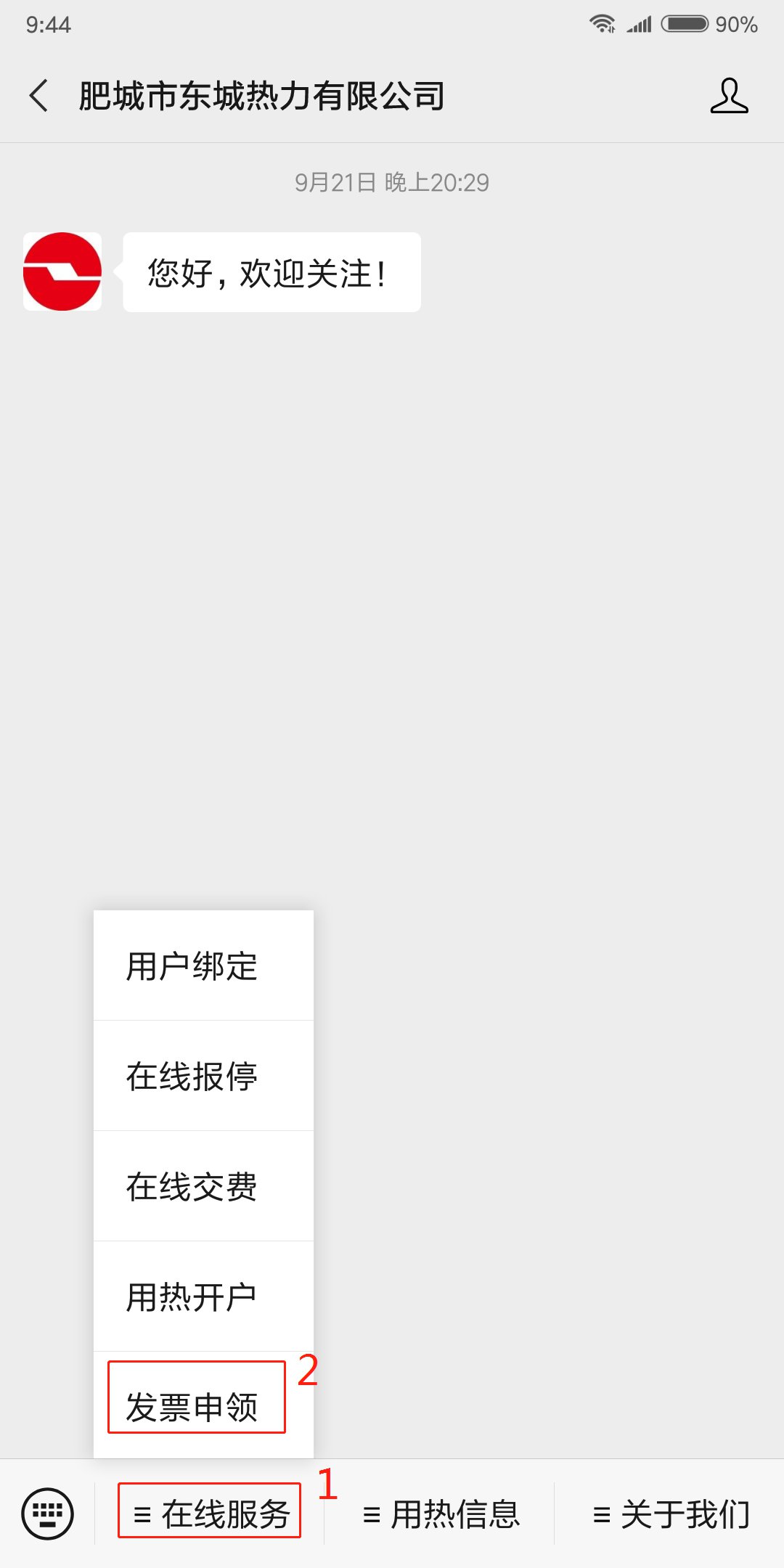 关注公众号“肥城市东城热力有限公司”,点击菜单栏“在线服务—发票申领”