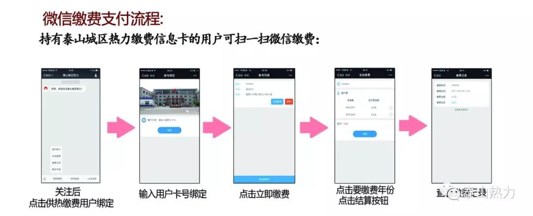 4.往年连续缴费的用户,关注新泰市新城热力有限公司微信公众号后,可直接微信缴费。注:一直未领取《用热登记证》的用户,可持采暖费交费收据到热力公司供热服务大厅办理。