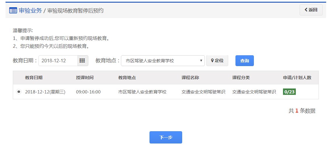 点击【审验现场教育暂停后预约】进入审验现场教育暂停后预约。选择,教育日期、教育地点点击“查询”,在查询结果中选择一个未预约满的场次,点击“下一步”进入步骤2,操作界面如下图所示: