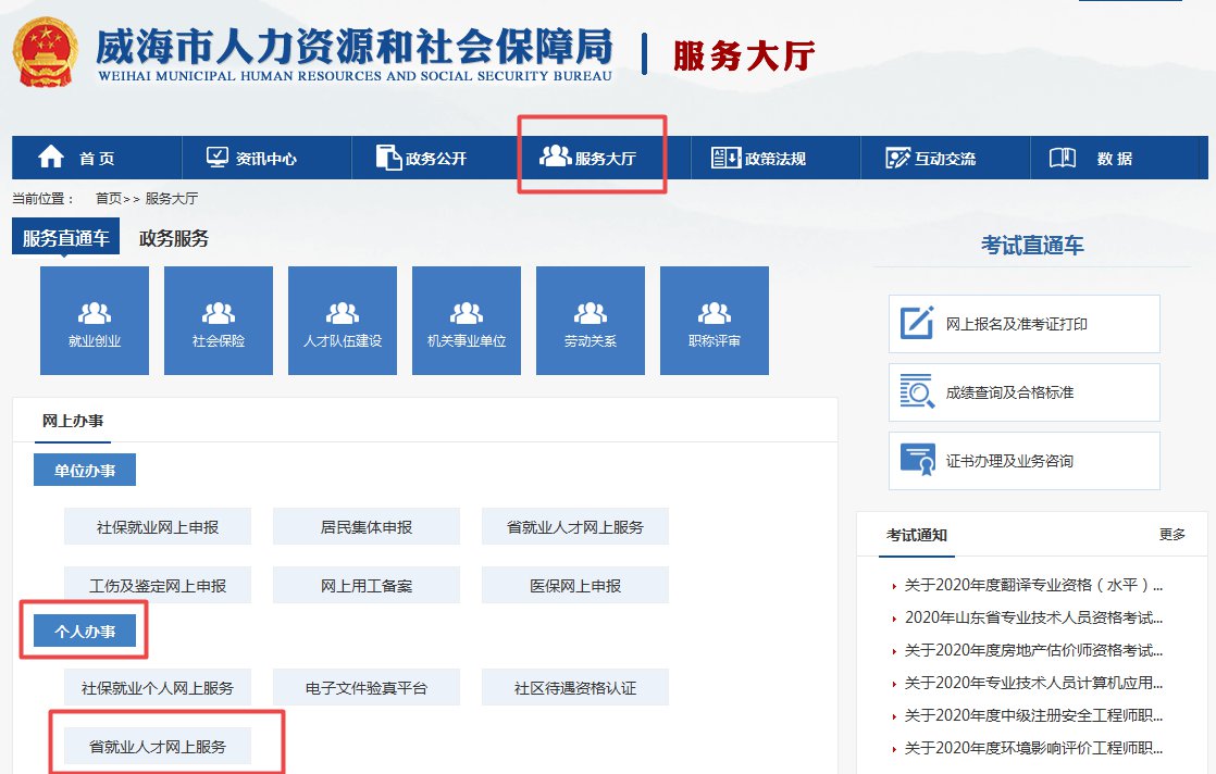 1.登录威海市人力资源和社会保障局官网(http://rsj.weihai.gov.cn/),点击“服务大厅”。