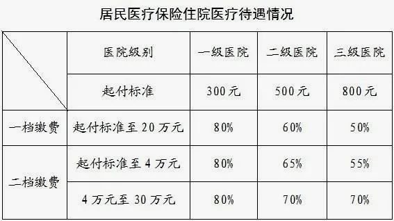 居民基本医疗保险住院起付标准为一级医院300元,二级医院500元,三级医院800元,在一个自然年度内,参保人员第一、二次住院设起付标准,从第三次住院起不设起付标准。