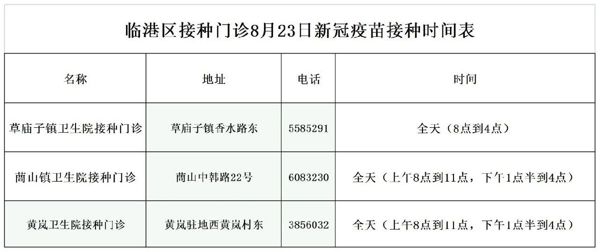 临港区接种门诊8月23日新冠疫苗接种时间表
