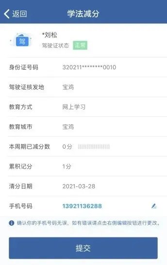3、查看提交界面展示信息,对于手机号码有误的,可跳转至修改手机号码界面进行修改,如数据无误,点击【提交】按钮。