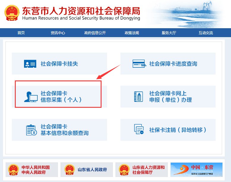 登录人社官网(http://dylss.dongying.gov.cn/),在界面左上方“网上服务大厅”栏目中点击“社会保障卡业务办理”。登录后,点击“社保卡信息采集”功能申领社保卡。
