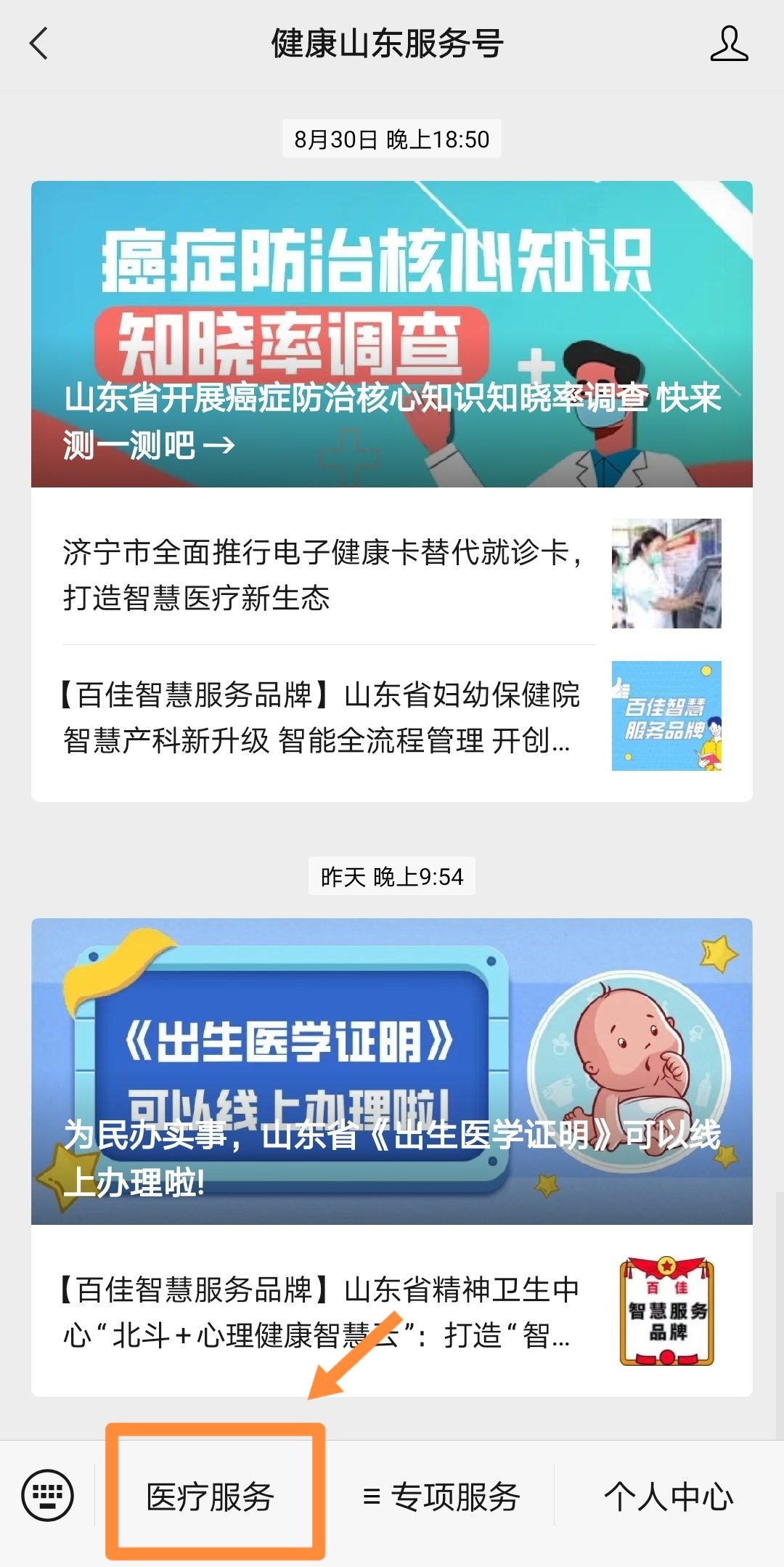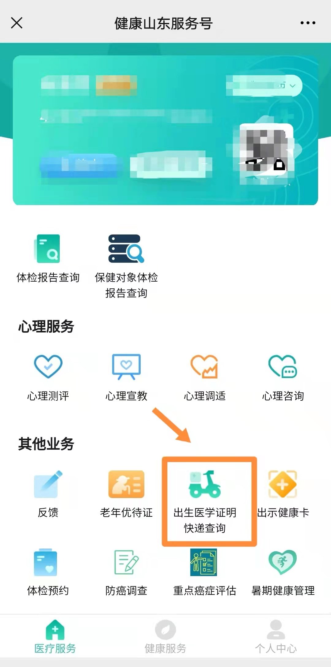 关注健康山东服务号,通过“医疗服务”-->“出生医学证明快递查询”进行线上办理。