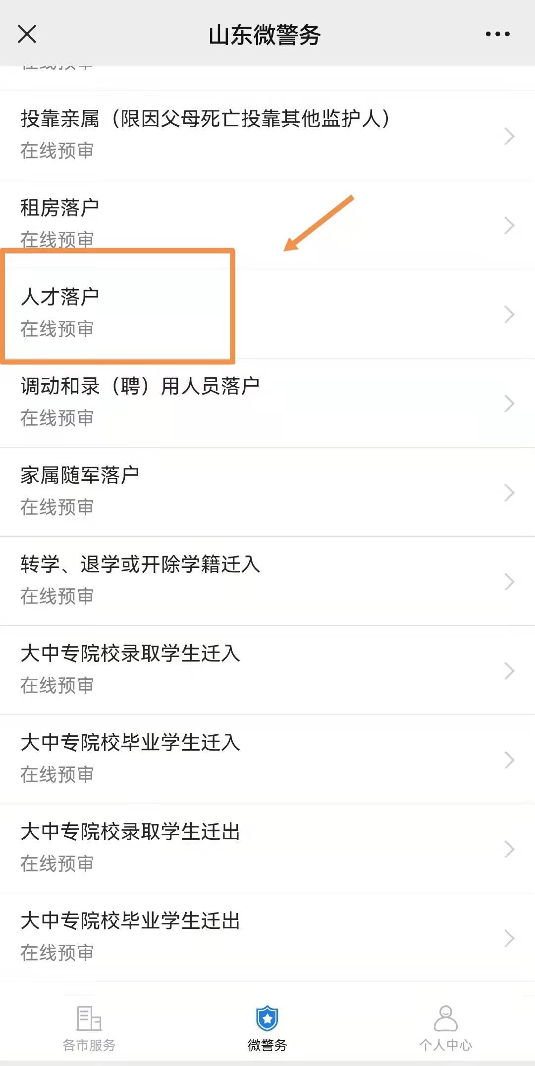 2、点击“户籍业务”中的“户口迁移”。然后点击“人才落户”在线申报。