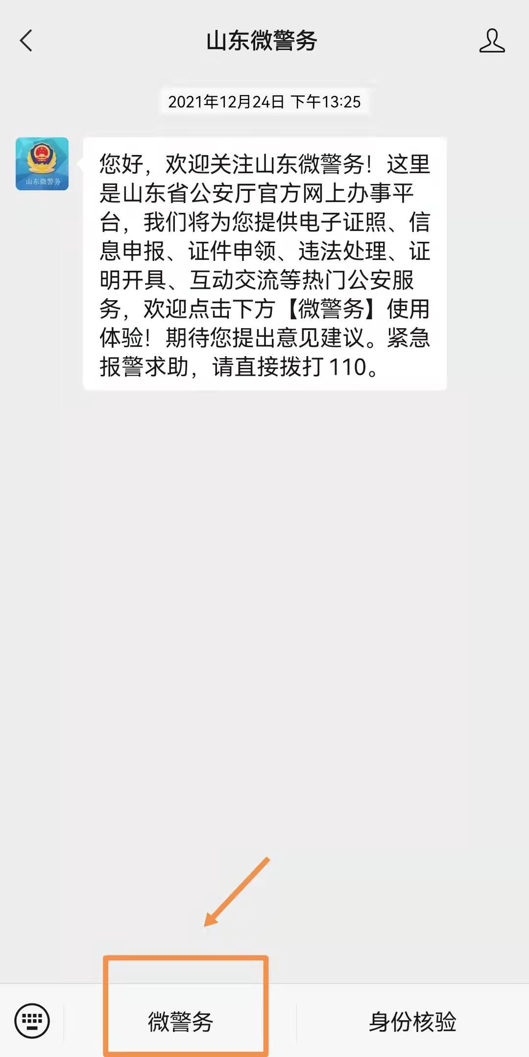 1、关注“山东微警务”公众号,点击“微警务”。