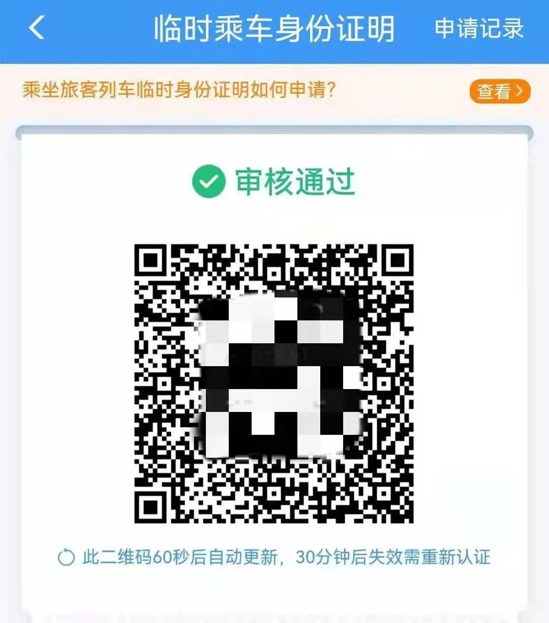 二维码60秒更新一次,30分钟后需再次进行实人核验。非注册用户关闭该页面后,查看时需要再次进行实人核验。在电子临时乘车身份证明有效期内,查看和再次实人核验不占用申请次数。铁路12306App注册用户可以查看1个月内所申请电子临时乘车身份证明的相关记录。