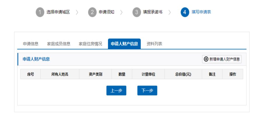 (7)添加家庭住房情况、财产信息(方法同添加家庭成员信息)。 注意:申请人家庭成员名下的财产信息也要如实填报, 特别是房产、汽车等有形资产,切勿瞒报漏报。如果存在弄虚作假、骗取保障资格行为,五年内不再受理保障申请