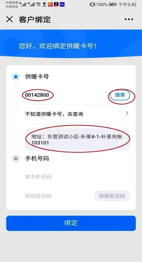 3)输入卡号,点击“搜索”,核对地址是否正确。输入在用的电话号码获取验证码后,完成“绑定”。