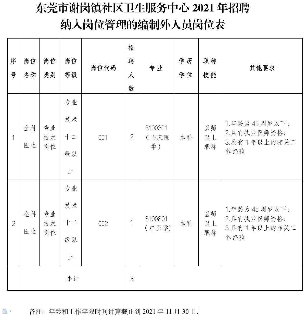 本次招聘全科医生岗位3人(含中医全科医生岗位1人),具体岗位情况和要求见岗位表。