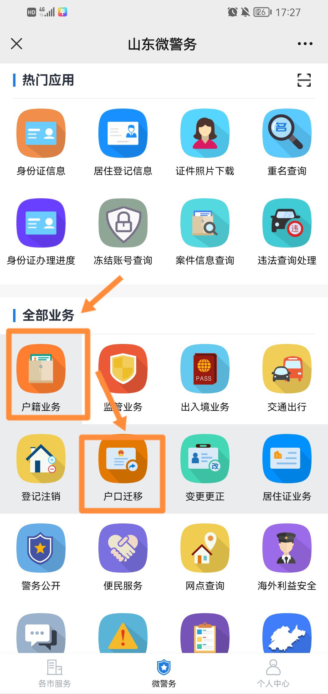 3、选择【户籍业务】,进入页面,点击【户口迁移】