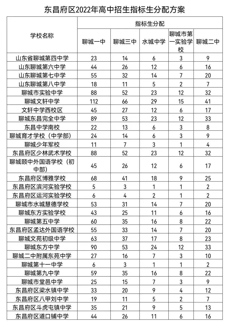 东昌府区2022年各高中招生指标生分配数量如下:
