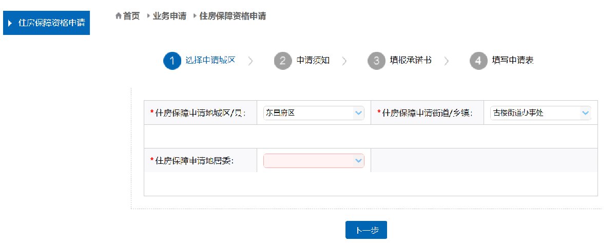 点击“住房保障资格申请”,选择公租房申请地的区县名、街道办事处及申请地居委会,填好后点击“下一步”