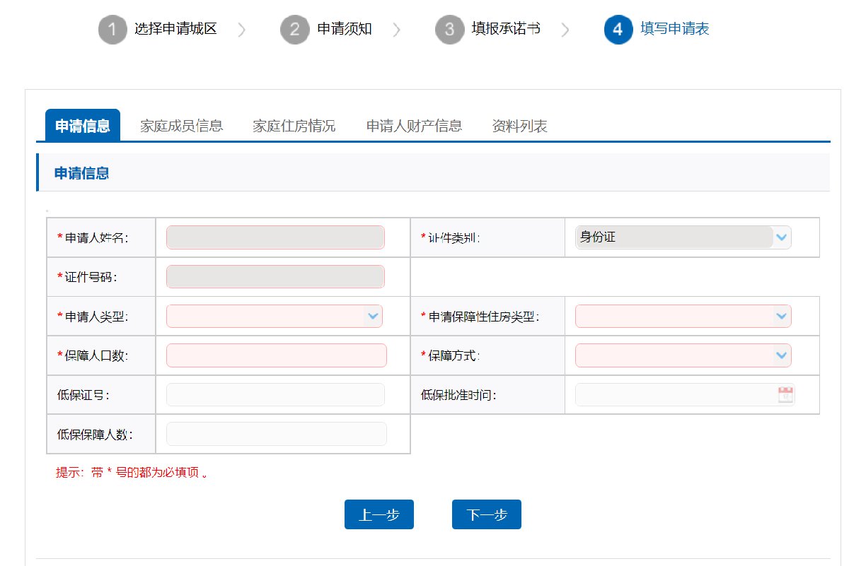 进入“填写申请表”,按照页面显示的内容将信息填写上去,包括申请信息、家庭成员信息、家庭住房信息、申请人财产信息及资料列表,填写完成后点击“提交”即可。