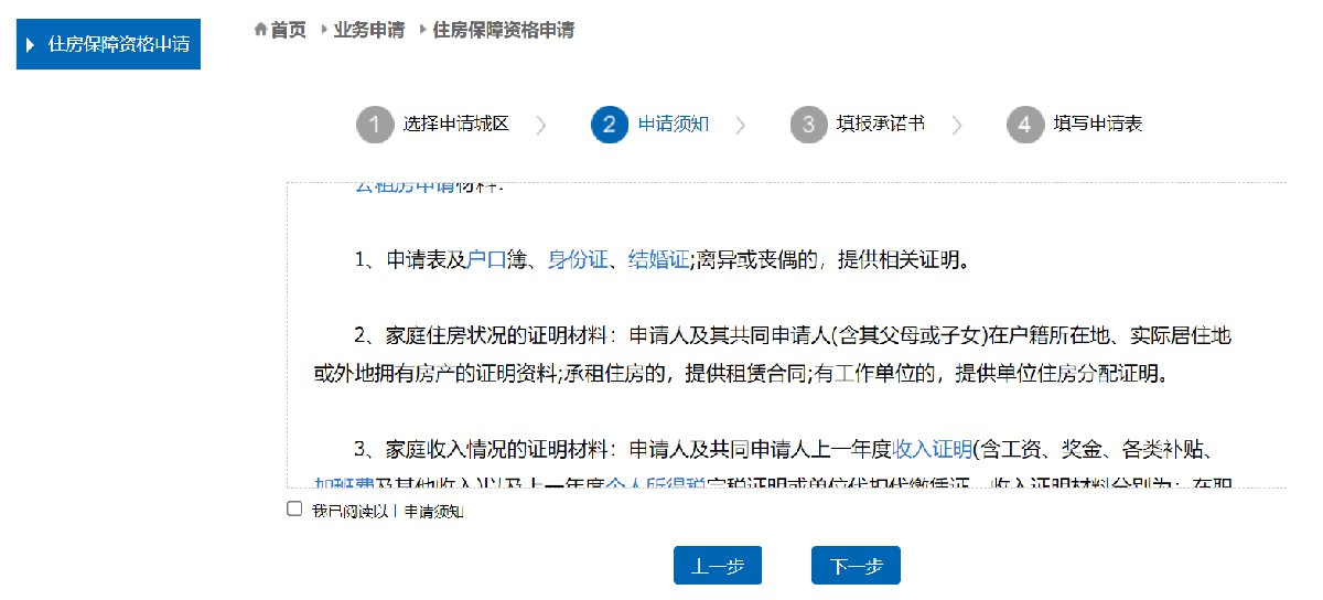 进入“申请须知”页面,阅读申请须知,完毕后勾选“我已阅读以上申请须知”,点击“下一步”