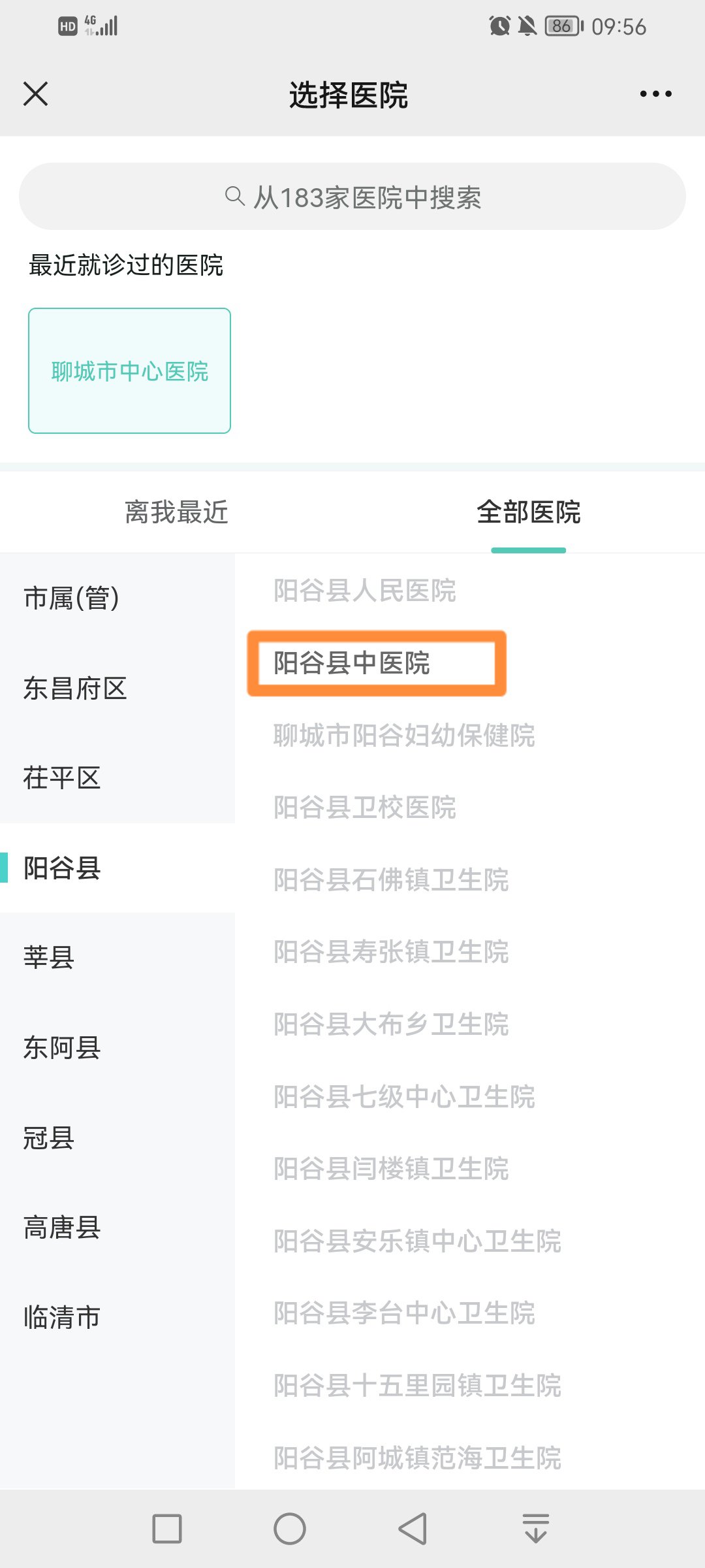 4、点击【阳谷县】选择【阳谷县中医院】