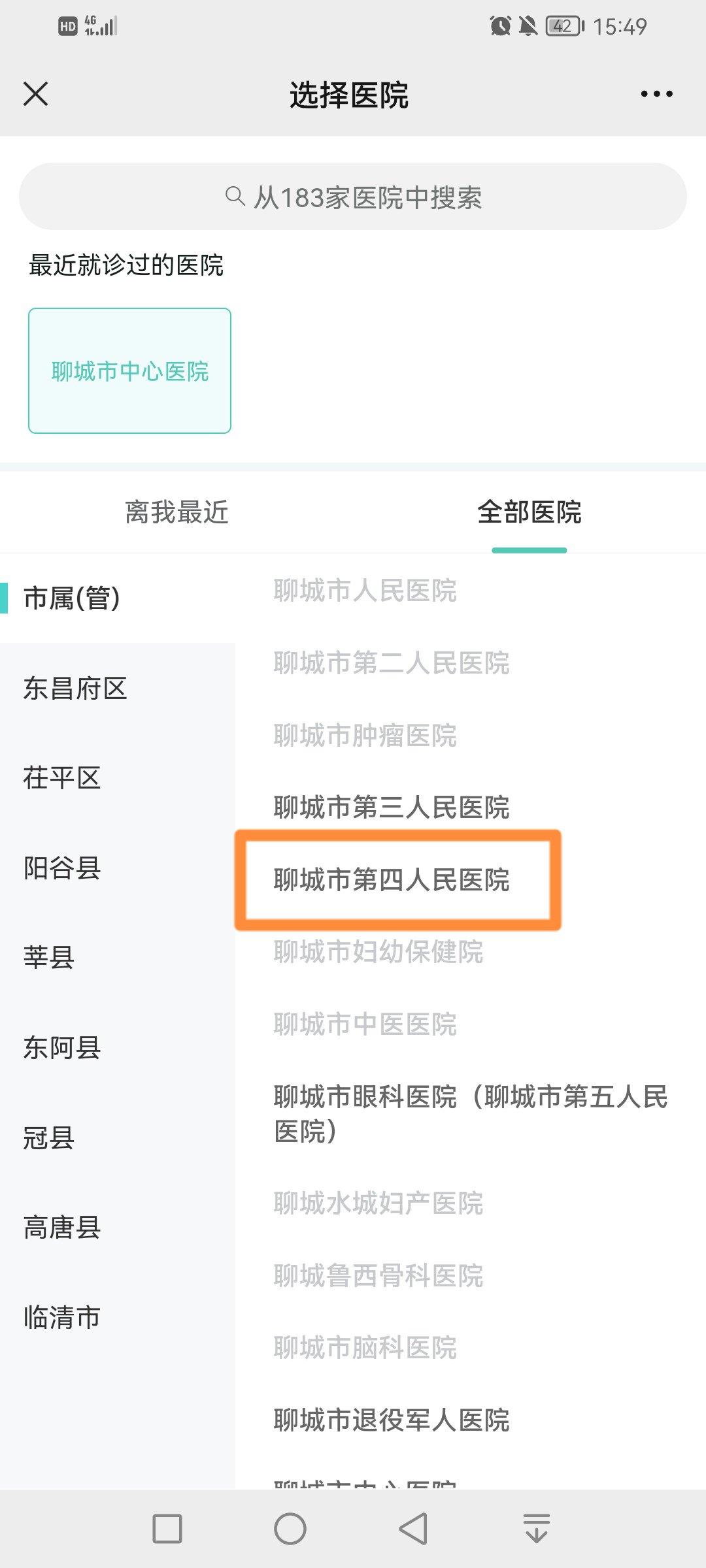 4、点击【市属(管)】选择【聊城市第四人民医院】
