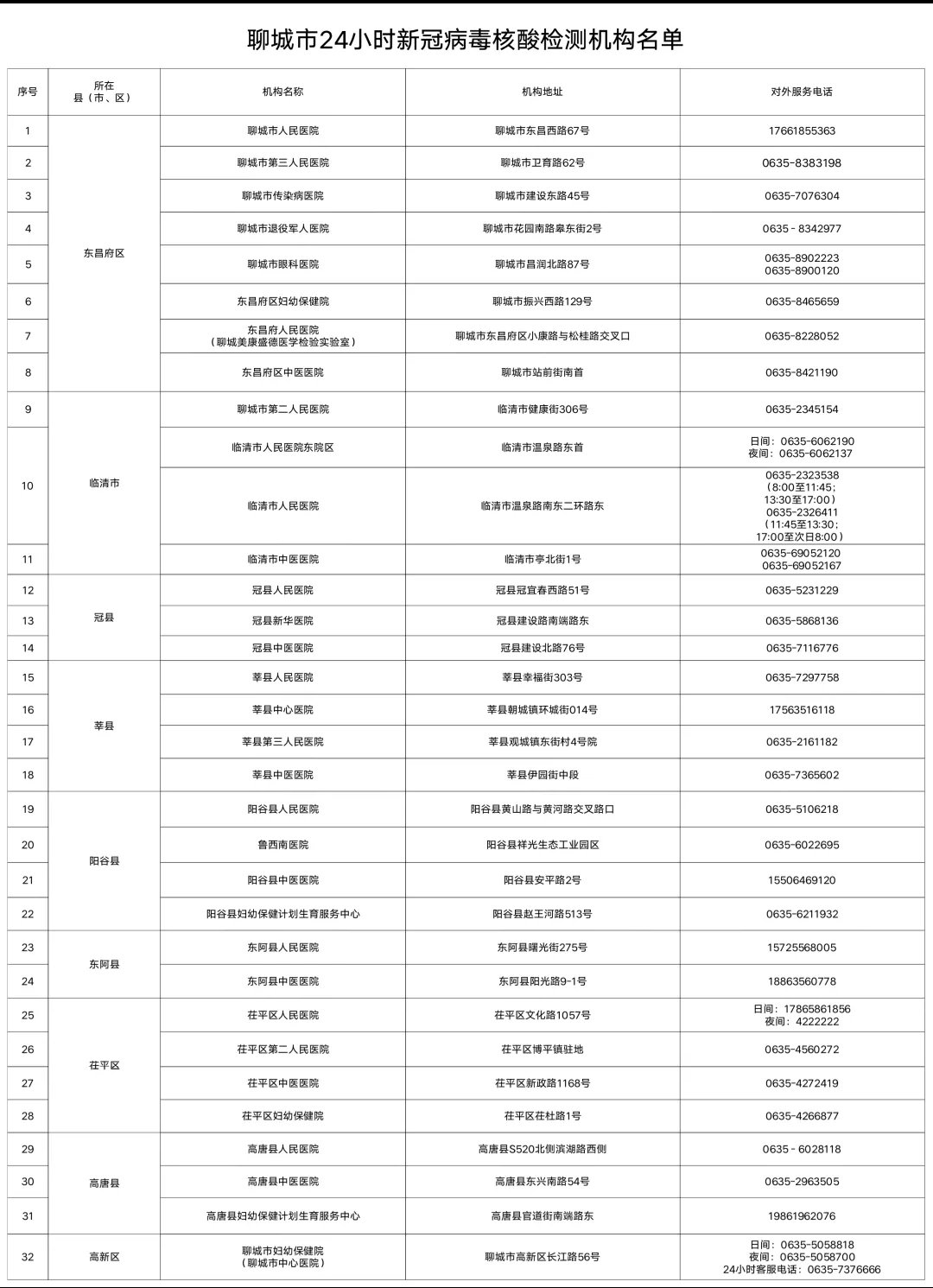 聊城市24小时核酸检测机构名单如下: